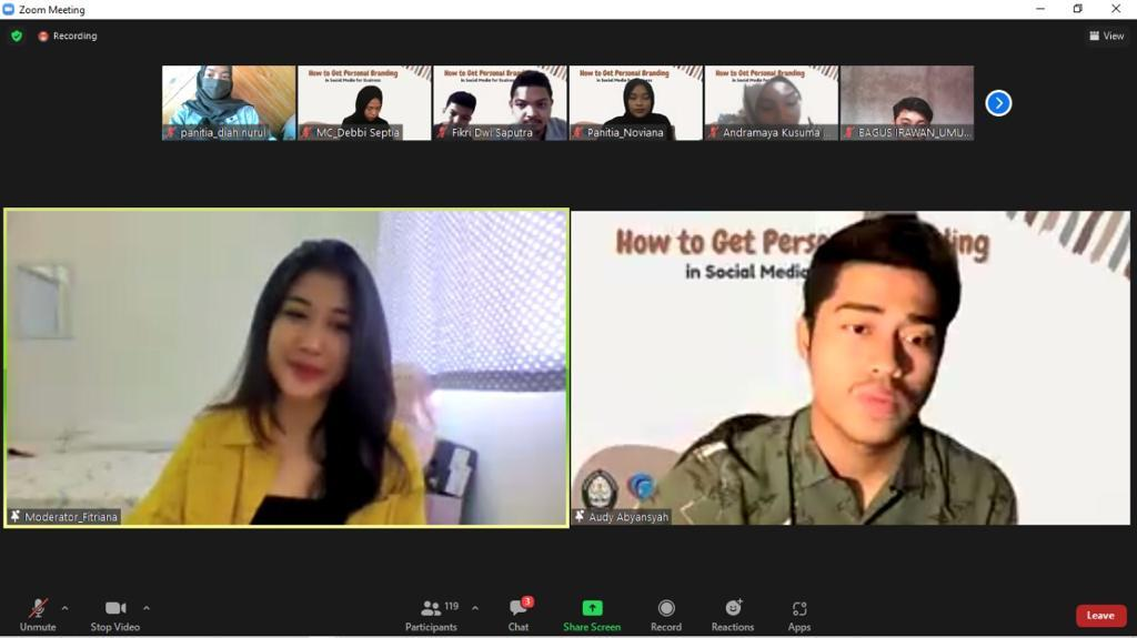 Semarang – Information and Public Relations Student Association (HIMAFORMAS) held an Entrepreneurship Webinar entitled “How To Get Personal Branding In Social Media For Business”. This activity was carried out on October 31 2021 through a Video Conference Zoom Meeting which was attended by nearly 200 participants, both from internal and external Str- Information and Public Relations.